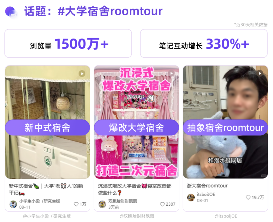 近期,#大学宿舍roomtour 浏览量高达1500万+,带动新中式宿舍、爆改大学宿舍、抽象宿舍pk 等各类改造与展示内容涌现。