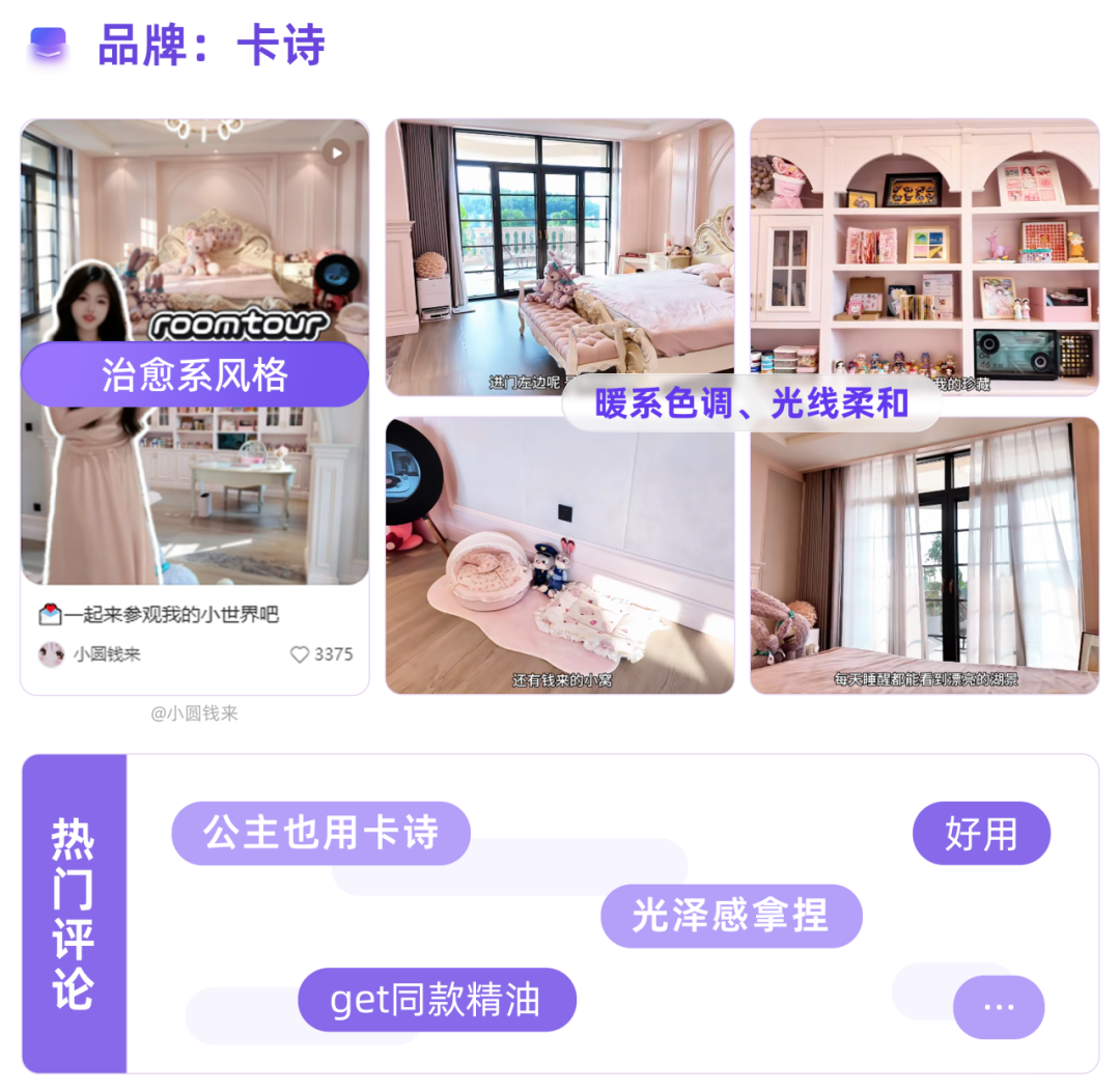 个护品牌卡诗合作达人@小圆钱来,通过一镜到底,搭配温暖柔和的色调,缓和的节奏推进,打造“治愈系空间”Roomtour。推窗见湖景的卧室,到整齐收纳衣物与宠物用品的衣帽间,最后聚焦浴室浴缸,丝滑植入产品,评论区高呼“公主也用卡诗、get同款精油” ,种草效果显著。