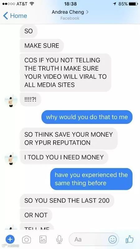 这就是美国俗称“裸聊诈骗”的犯罪形式,先通过fb等各种方式发信息加好友试探,再发信息问候拉近距离,在视频聊天中悄悄录下来,最后以上传视频威胁受害者打钱。