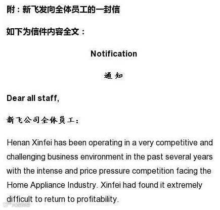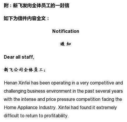 信中表明:新飞公司不准备进行清算,而是通过重整的方式,取得法律保护,使公司能够进入相对安全的经营环境,并专注公司再生的战略设计。