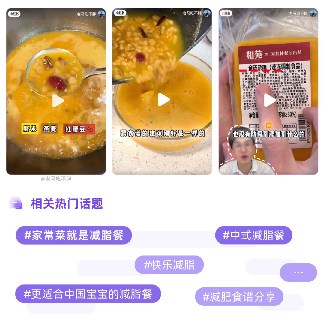 体重管理相关热门话题中还出现:#中式减脂餐、#家常菜就是减脂餐 等,此前,“馒头减脂法、盖浇饭减脂”等内容也十分火爆。