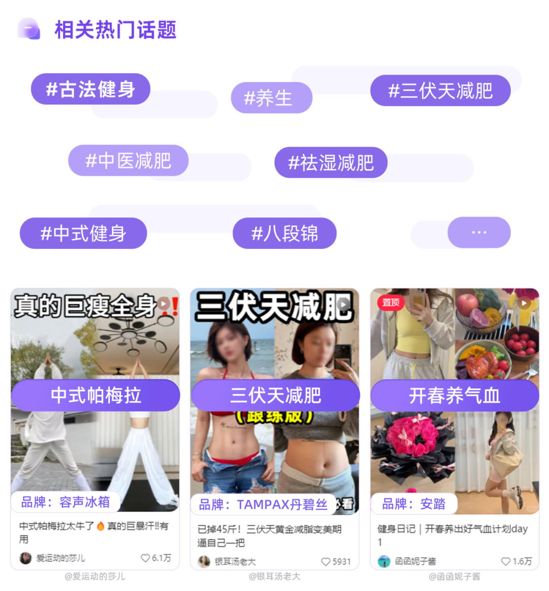 千瓜数据显示,“体重管理”内容关键词中,除了“快速、掉秤、效率”等,“养生、气血、肠胃”等也与小红书用户的减重增肌心智密切相关,话题中出现#古法健身、#中医减肥、#三伏天减肥等。