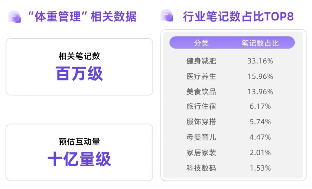 过去,体重管理是个体选择,现在变成了集体命题。千瓜数据显示,2025年1月到5月15日,小红书“体重管理”相关笔记数达百万级,预估互动量达十亿量级,各行各业纷纷入局,覆盖“吃、练、养、穿”等。