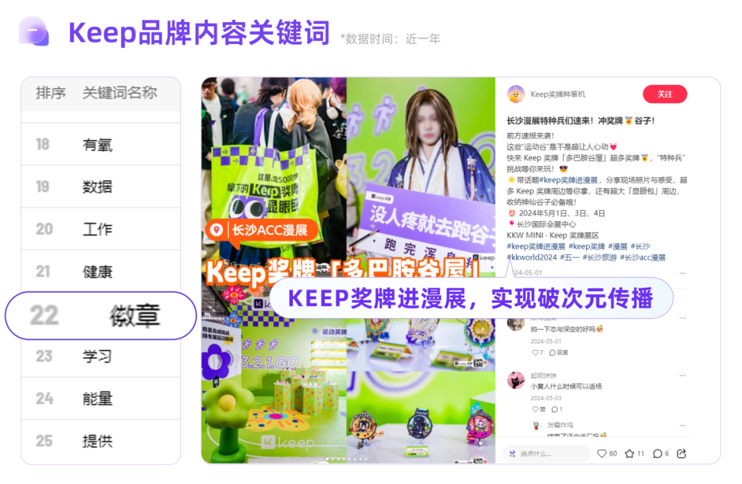 用奖励机制和虚拟/实际成就,取代意志力的硬抗,Keep早就深谙此道,近一年品牌内容关键词,“徽章”位居TOP22,通过潮玩属性的徽章,将不同阶段的运动目标转化为惊喜奖励,深入不同圈层,掀起一阵“运动谷”热潮。