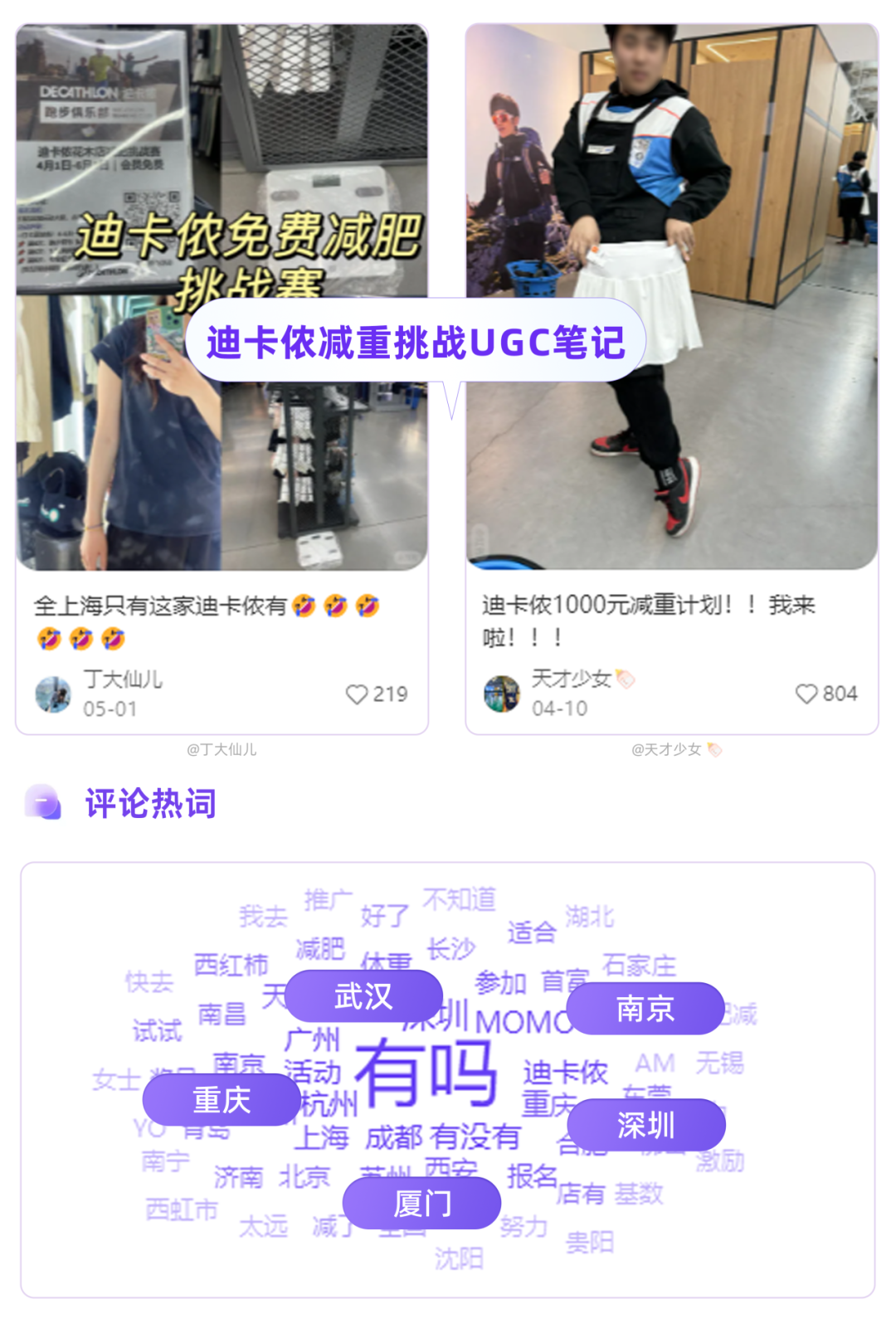 品牌纷纷化身陪伴者+激励者,把体重管理变成一场升级打怪的游戏,用社交激励(打卡)+物质激励(奖金)犒劳减重人群,妥妥的“西虹市首富”照进现实。素人博主分享迪卡侬减重挑战赛的UGC笔记吸引不少用户留言问询,参与热情高涨。