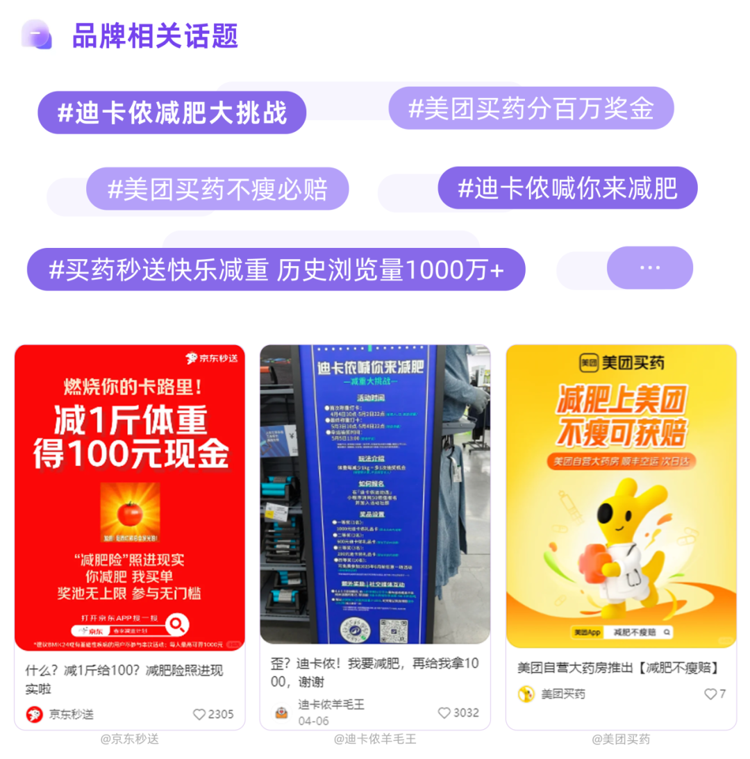 不少品牌高调入局,在小红书联动线上线下活动:京东买药减1斤得100、美团买药不瘦包赔、迪卡侬减肥大挑战……商业投放和自来水内容热度齐飞,用户戏称“全世界都在变着法地劝我减肥”!