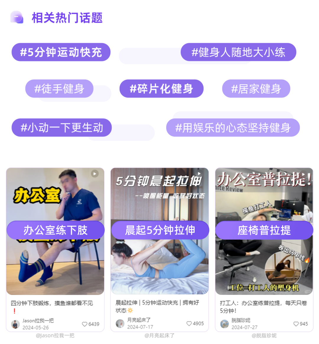 热门话题显示,#5分钟运动快充、#健身人随地大小练、#碎片化健身 等成为管理体重的新解法,小红书用户热衷于随时随地小动一下:办公室里体验座椅普拉提,洗漱时练一练深蹲……只要“动起来”就有利于热量消耗与体型塑造。
