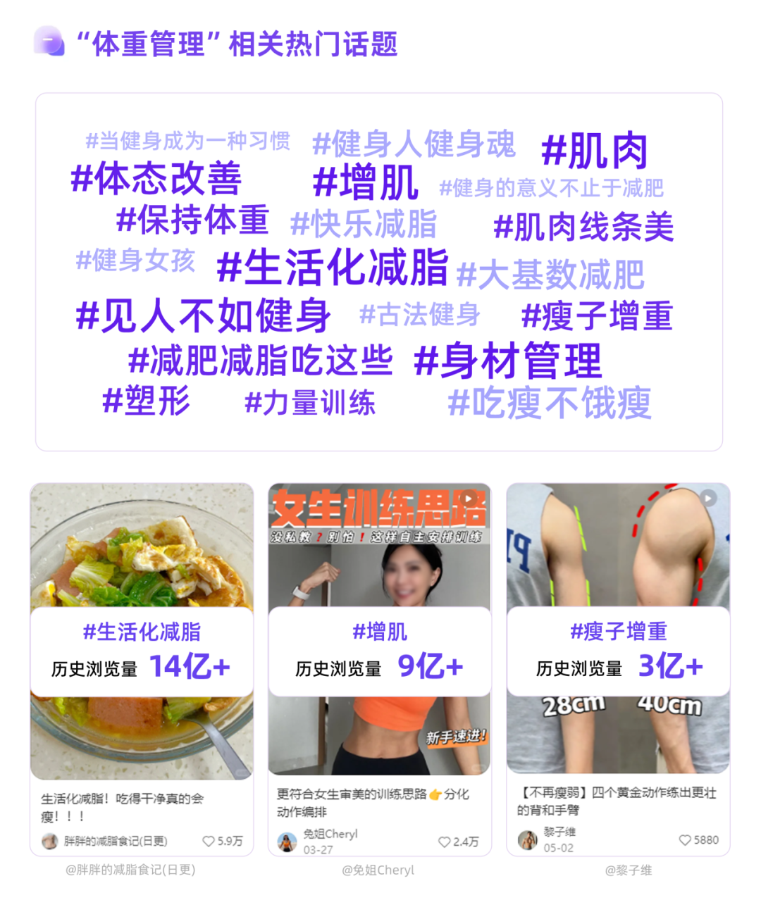 小红书平台潮向也发生变化,涌现#生活化减脂、#增肌、#体态改善、#力量训练、#瘦子增重 等热门话题,体重管理成为日常生活一部分,人们不止要告别肥胖、减肥减脂,也要告别瘦弱、增肌增重,“双向”管理体重,强健体魄。