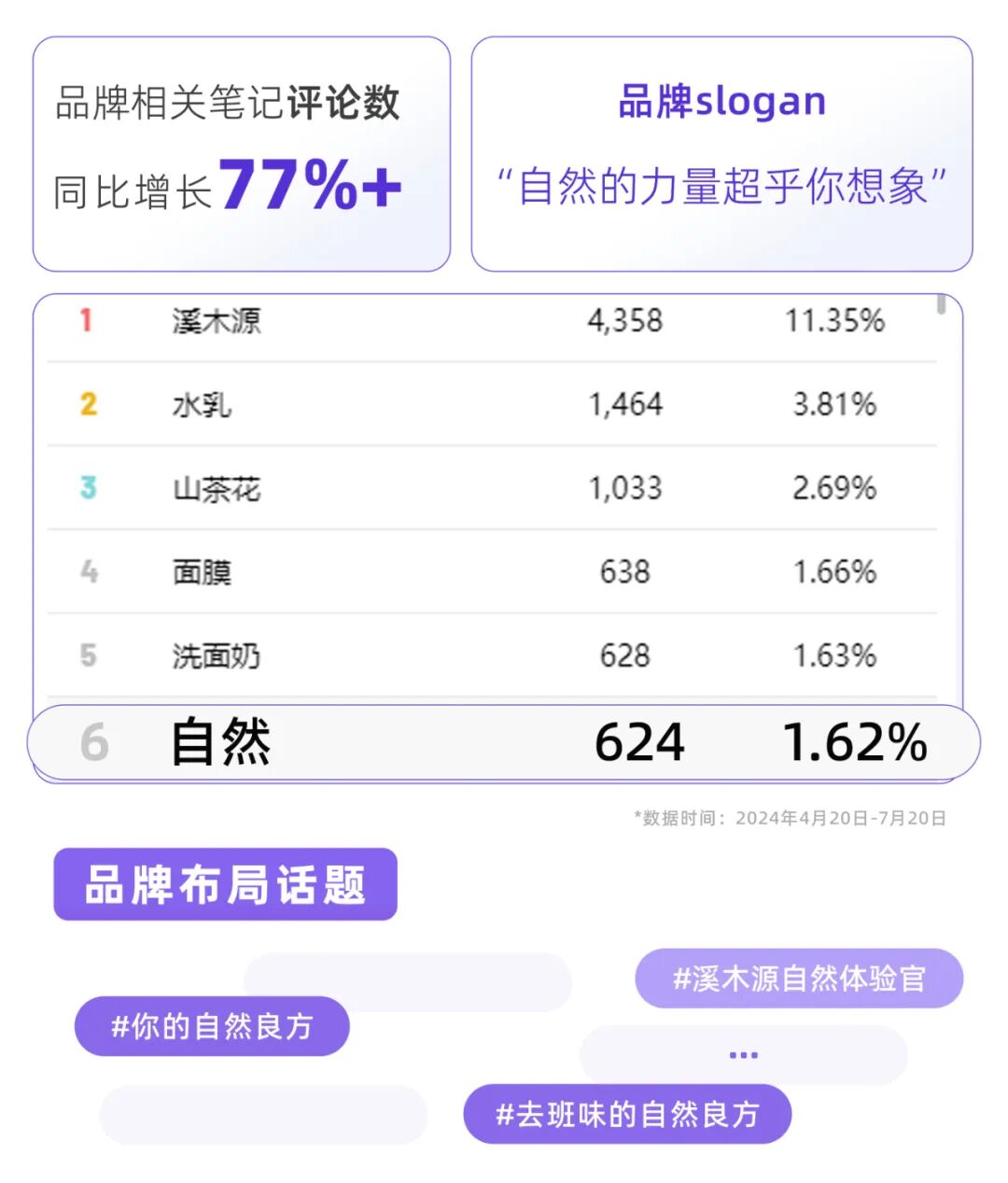 通过这一营销活动,溪木源将品牌理念中的“自然”从产品的功能利益点,上升至全新的高度,千瓜数据显示,活动上线3月内,品牌相关笔记评论数同比增长77%+,品牌内容关键词中,“自然”从200名开外飙升至TOP6。