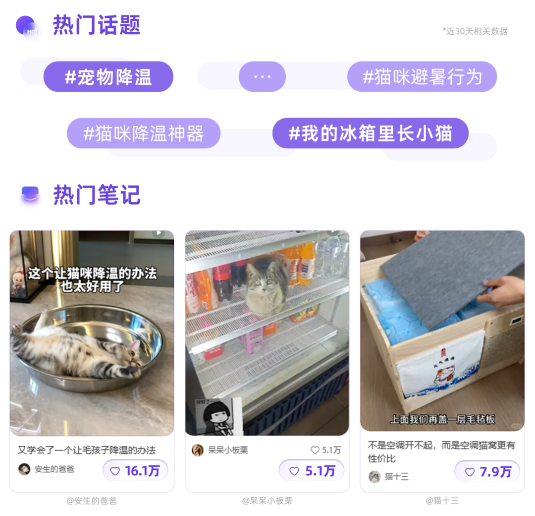 千瓜数据显示,#猫咪避暑行为 近30天热度破百万,同时#我的冰箱里长小猫 #猫咪降温神器 等话题涌现。
