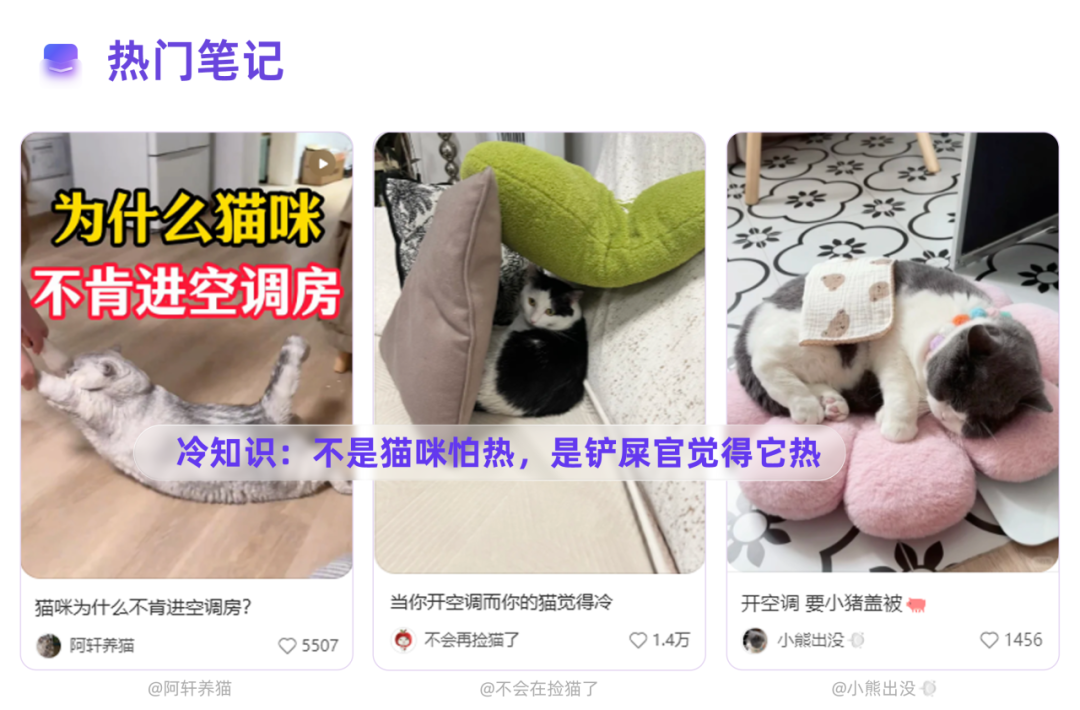 反转来了!“猫咪为什么不肯进空调房”、“猫咪吹空调感冒”等冷知识揭示真相:不是猫咪怕热,是铲屎官觉得它热,堪称宠物界“你妈觉得你冷之秋裤风云”。或许,用户是借宠物的名义,完成内心的“降温仪式”。