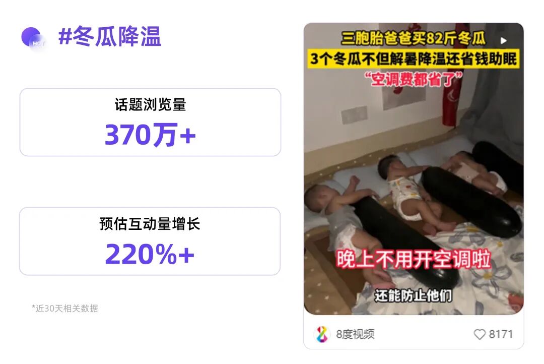 “三胞胎爸爸的降温法火了!”一口气买82斤冬瓜,宣称“空调费都省了”:解暑、省钱还助眠,评论区瞬间成为抄作业现场,话题#冬瓜降温 近30天浏览量超百万。