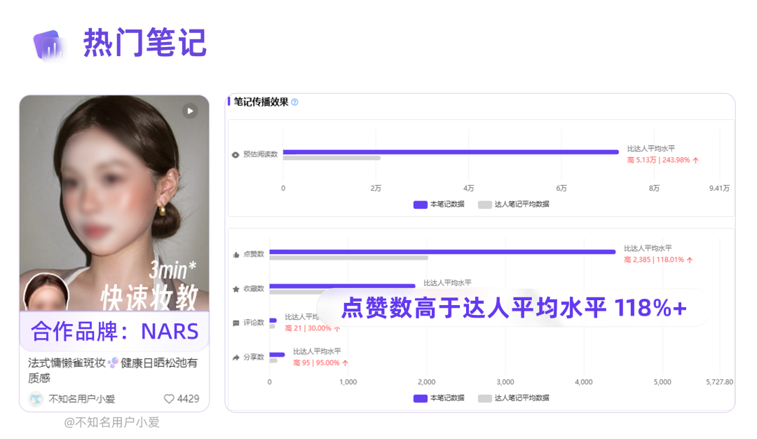 品牌NARS 联合达人@不知名用户小爱 发布《法式慵懒雀斑妆🫧健康日晒松弛有质感》,展示夏日雀斑妆教程,结合产品高显色的特点,突出腮红,让皮肤呈现健康日晒的效果,近30天笔记点赞量4000+,超出达人平均水平118%+。