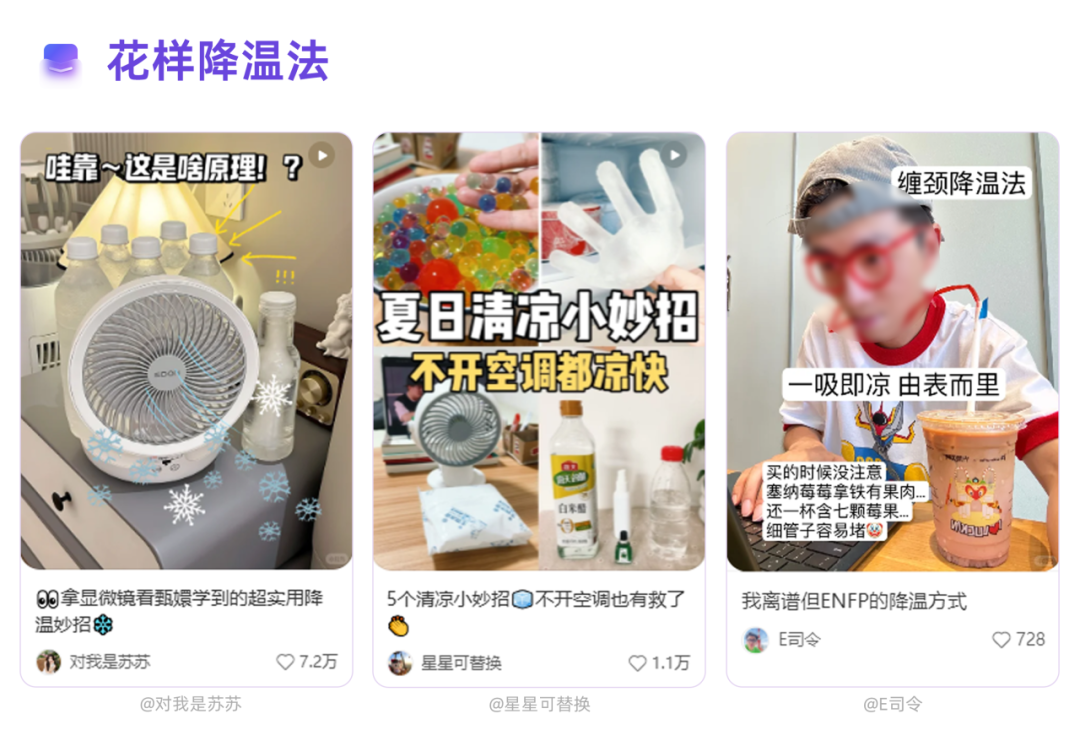 千瓜观点,降温的快乐,或许不在于装备多高级,更是创意多跳跃。对品牌而言,或可尝试用低成本物品设计,帮助用户从“被动忍受炎热”转向“主动创造清凉”,撬动UGC内容,打造“有趣”、“会玩”的品牌形象,实现“精神胜利法”。