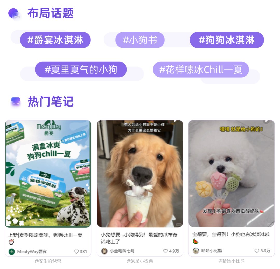 宠物品牌爵宴,推出夏日限定新品冰淇淋,以宠物「专研配方」精准拿捏健康和降温需求。在小红书同步发起“夏日多巴胺计划”,并布局话题#花样嗦冰一夏、#夏里夏气的小狗等,评论区“冰淇淋、爵宴”位列前排,种草效果显著。