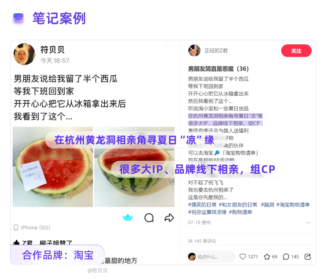 品牌投放小红书笔记《男朋友简直是恶魔(36)》,通过情侣间的恶作剧:男友留了半个西瓜,实际“西瓜已被掏空”,女友“借题发挥”:“你先惹我的,我也要去相亲了”,点题“夏日凉缘”,链接品牌活动。把“消暑好物”转化为生活的趣味互动,让夏日清凉好物自然融入场景,和消费者“喜结凉缘”。