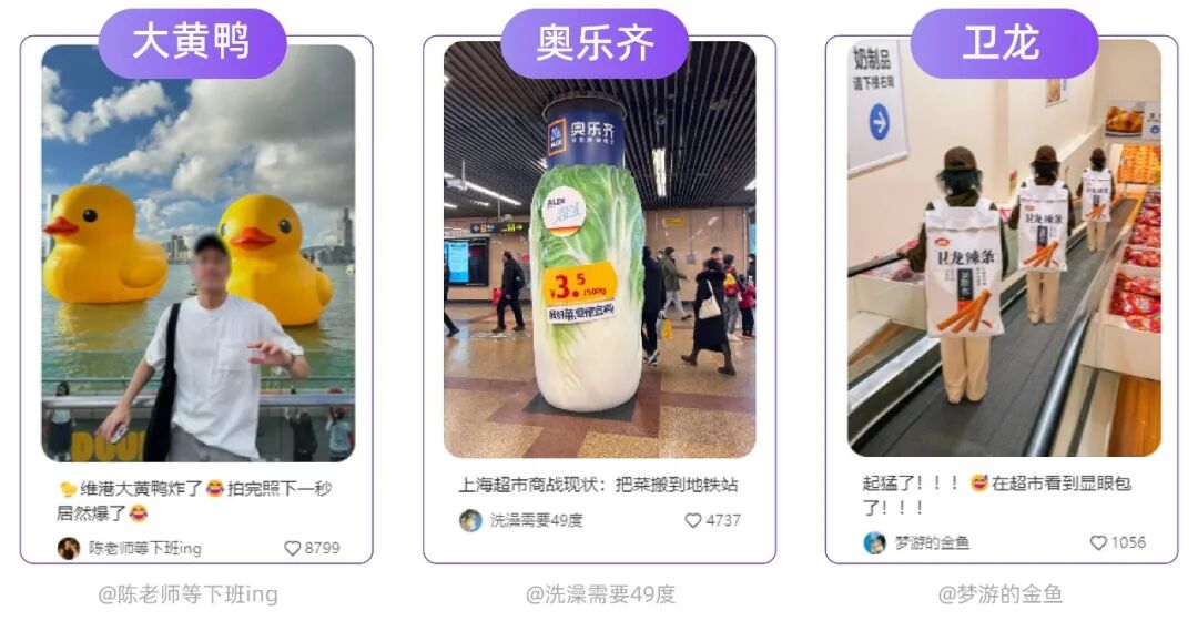 前有浴缸里的小黄鸭化身维港巨物、LV带着大型经典款箱包高调现身上海外滩,后有卫龙“显眼包”游街、奥乐齐把菜“种”进地铁……不难发现,此类“巨物”将品牌符号作为营销的「视觉锤」,在瞬间印刻消费者的记忆,加深品牌印象。