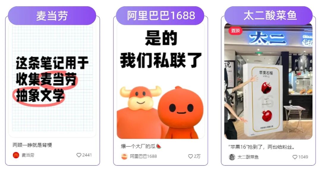 此外,各大品牌也纷纷下场:麦当劳向网友征集品牌抽象文学、阿里巴巴单方面官宣和淘宝的骨科邪门CP、太二酸菜鱼全款拿下“苹果石榴”……