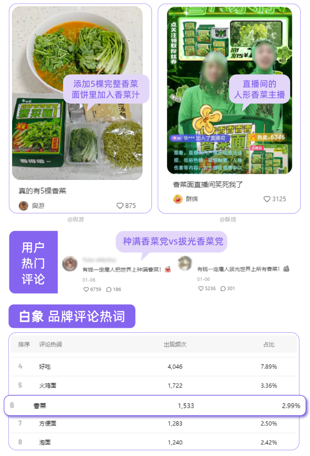 白象将香菜从面食中的“配角”提拔为“主角”,引发小红书“种满香菜党”和“拔光香菜党”的热议,相关评论点赞数超6000。千瓜数据显示,近一年白象品牌评论热词中,“香菜”位列TOP6,通过口味创新赢得关注,在康师傅和统一两大巨头的夹击下,靠「香菜方便面」这一大单品开辟新市场。