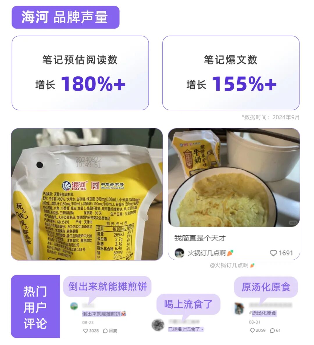 被誉为“牛奶界乐事”的海河,近期推出煎饼果子口味牛奶,千瓜数据显示,该产品上新次月,品牌声量直接飞升,相关笔记预估阅读数同比增长180%+,笔记爆文数增长155%+。