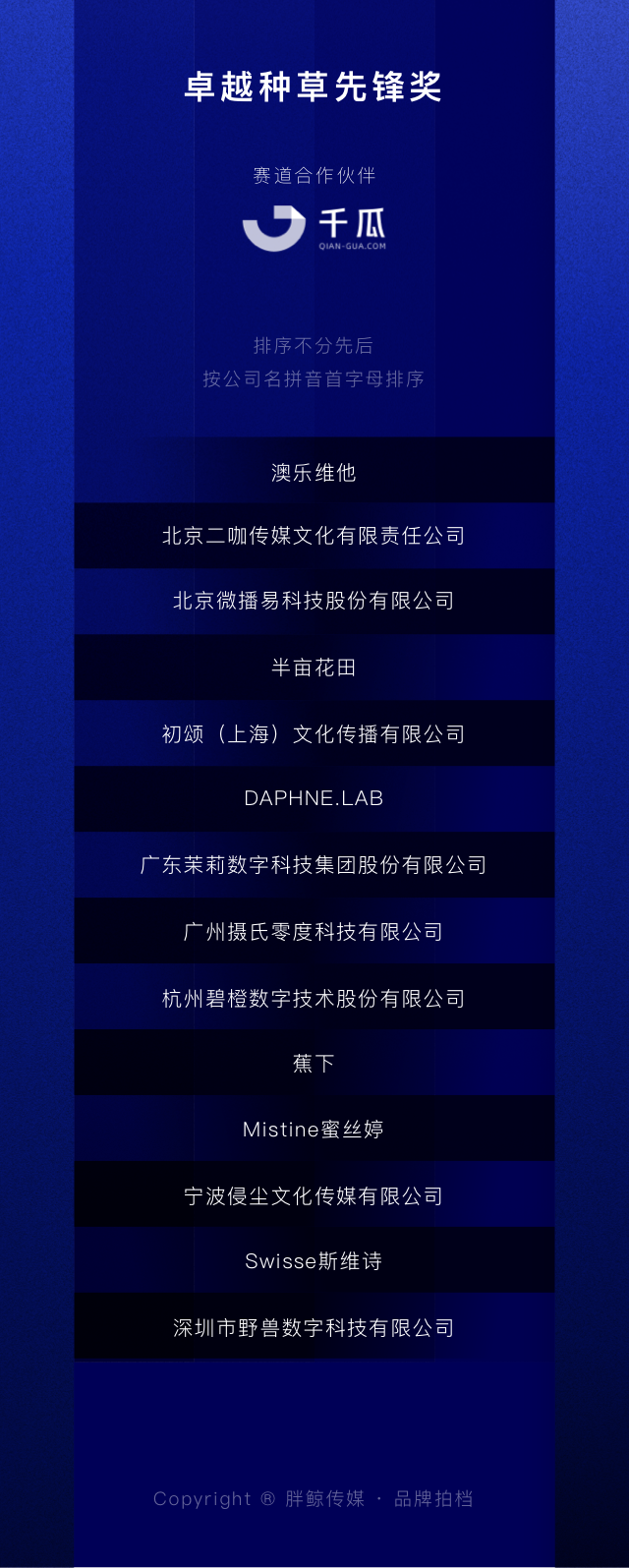 卓越种草先锋奖是胖鲸联合千瓜推出的年度特别奖项。旨在表彰数字化浪潮下,各行业领域敢于探索勇于尝试、积极开展营销种草布局、推动品牌创新并取得卓越成就的品牌、服务商与相关机构。