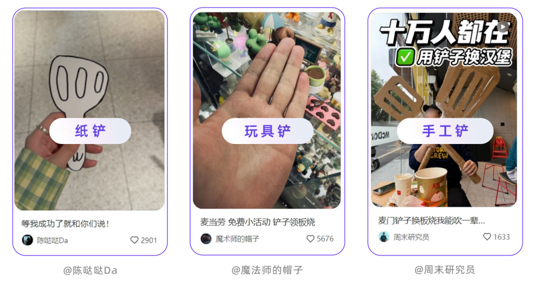 这届网友主打“没提到就是可行”的准则,晒出“花式铲子”(猫砂铲、无实物表演之当场发誓版、手工铲等)。UGC内容发酵后,越来越多人打开脑洞,下场玩梗“无铲阶级”、“脑铲”等。对比直接免费领汉堡,赋予铲子“显眼包”的社交货币属性,带动传播。