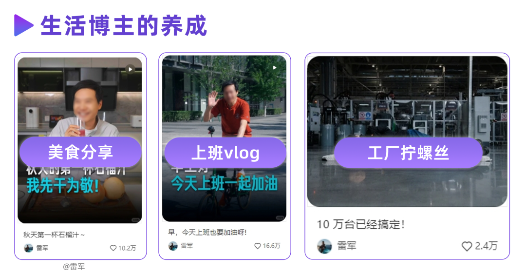 千瓜认为,创始人IP,属于品牌形象打造的高阶玩法。以“雷军”IP走红为例,人格魅力所带来的绝佳路人缘,赋能品牌。CEO所展示鲜活、积极的生活状态,助力品牌生长出一个更饱满的内核。当用户在品牌身上完成对“个人”的情感投射,正是「活人浓度」拉满的表现。