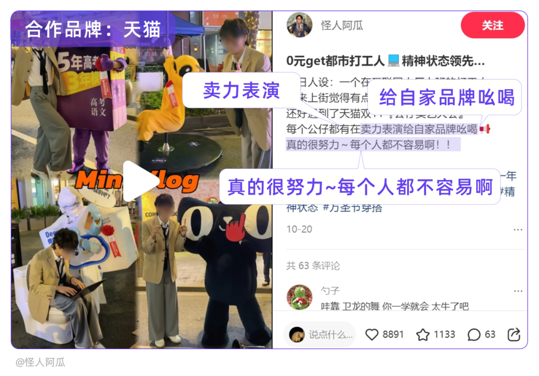 此前,蜜雪冰城也凭借“雪王”憨态可掬的外表,魔性洗脑的内容,开启用户二创,传播中赚足眼球。不久前「双11公仔卖艺大会」,淘宝、卫龙、麻辣王子等品牌公仔现身街头,聚众“卖艺”。这些品牌吉祥物,不再只是屏幕上的像素点,更成为用户的欢乐源泉,对品牌的好感也不断提升,引发话题,形成裂变传播。