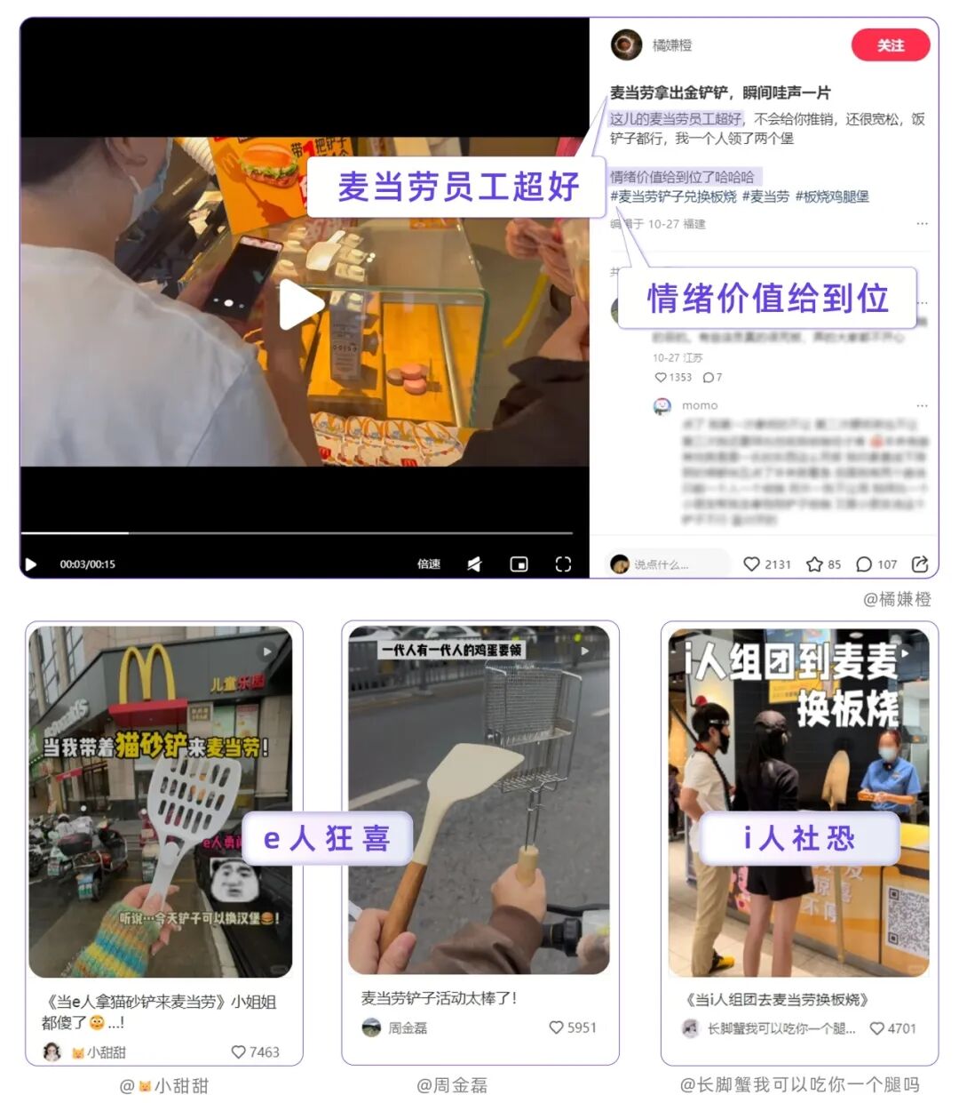 达人@🐱小甜甜 发布“拿猫砂铲来麦当劳”笔记,记录与店员互动的搞笑过程,素人博主@橘嫌橙 按头安利:麦当劳员工超好,情绪价值给到位了!!店员的不扫兴,引得e人狂喜,同时也触发i人社死发言:吃个汉堡偷感好重、一次兑换换来终生内向……效果拉满。
