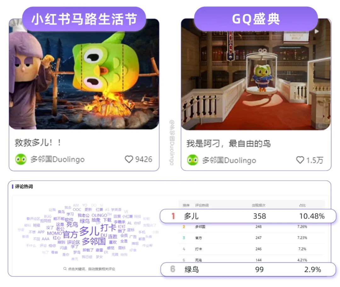 千瓜数据显示,「多邻国」品牌笔记评论中,“多儿”位居TOP1,“绿鸟”等与IP相关的内容跻身前十,形象深入人心。