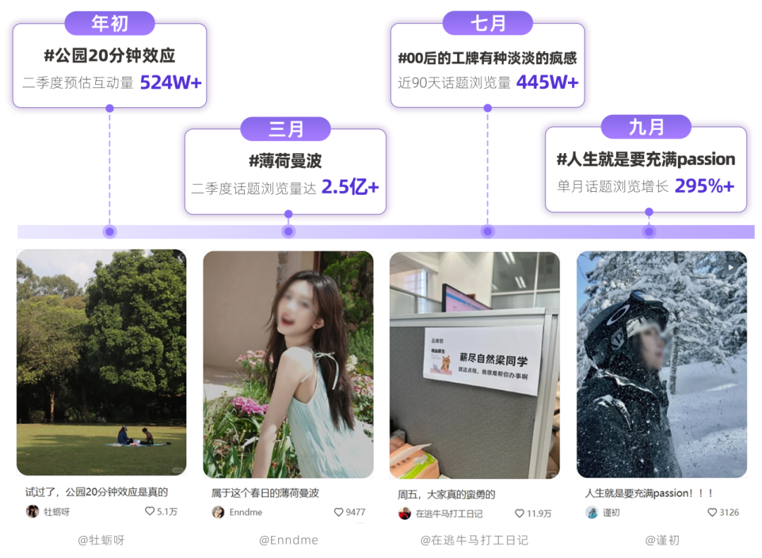 调研数据显示,2024年以“活人感、生命力”为代表的内容,种草笔记数、预估互动量同比增长340%+。照见大众的情绪倾向,热门内容层出不穷:
