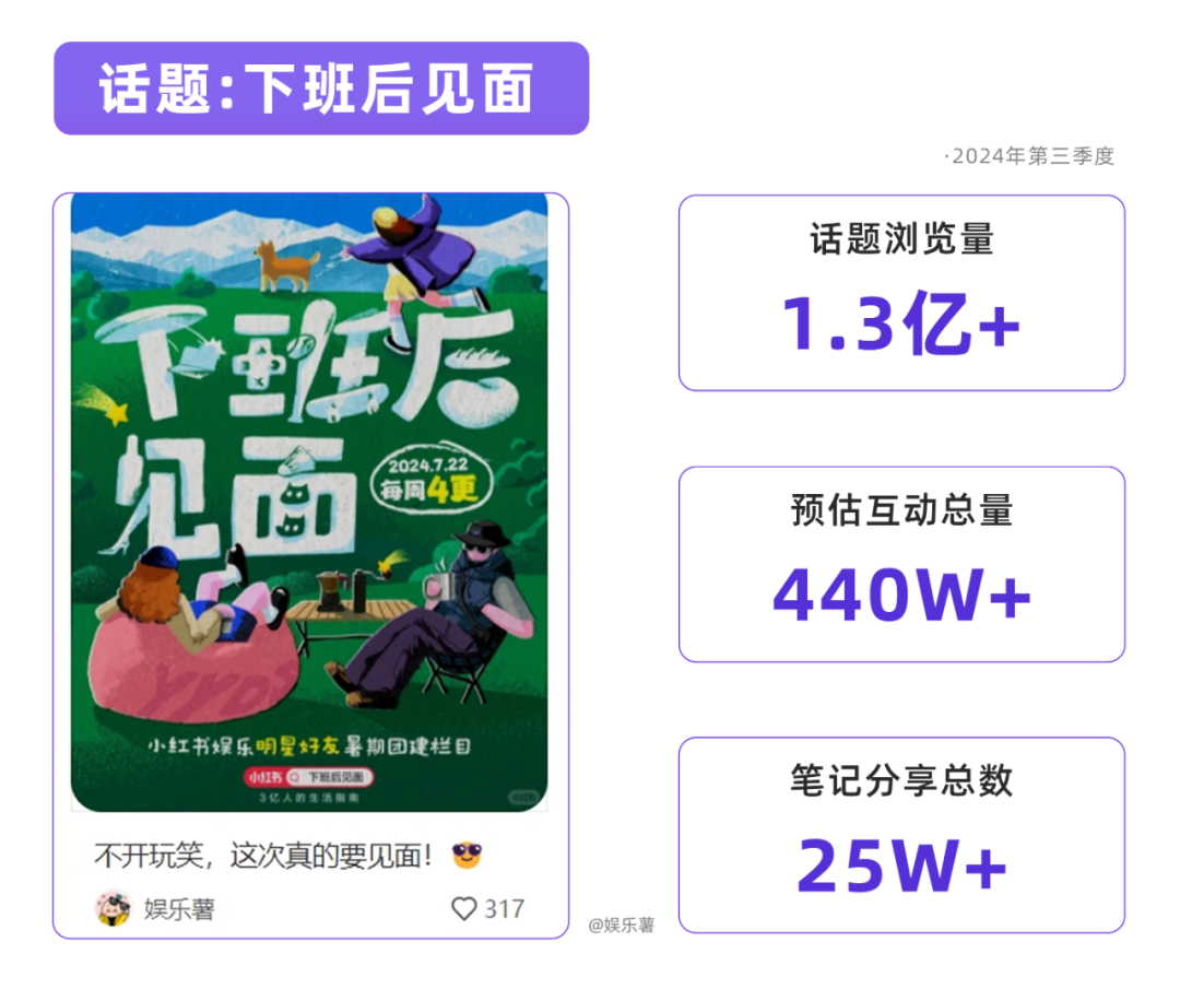 小红书筹备暑期综艺【下班后见面】,展现明星的下班社交。不少明星把小红书当成朋友圈,褪去星光、分享日常,满足用户对“內娱活人”的呼唤。