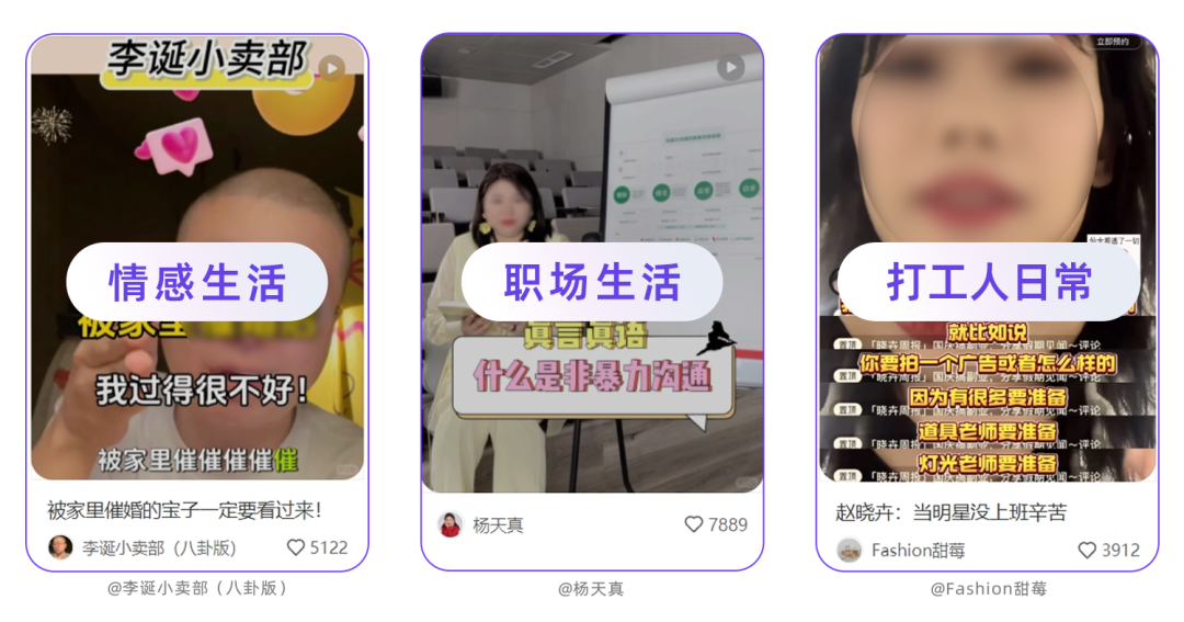 同时,泛生活直播兴起,李诞、杨天真、苗苗等明星出镜分享情感、学习、职场等内容,从生活的某个具体切面出发,拓展出不同风格的泛生活化内容,和社区用户形成更紧密的连接。