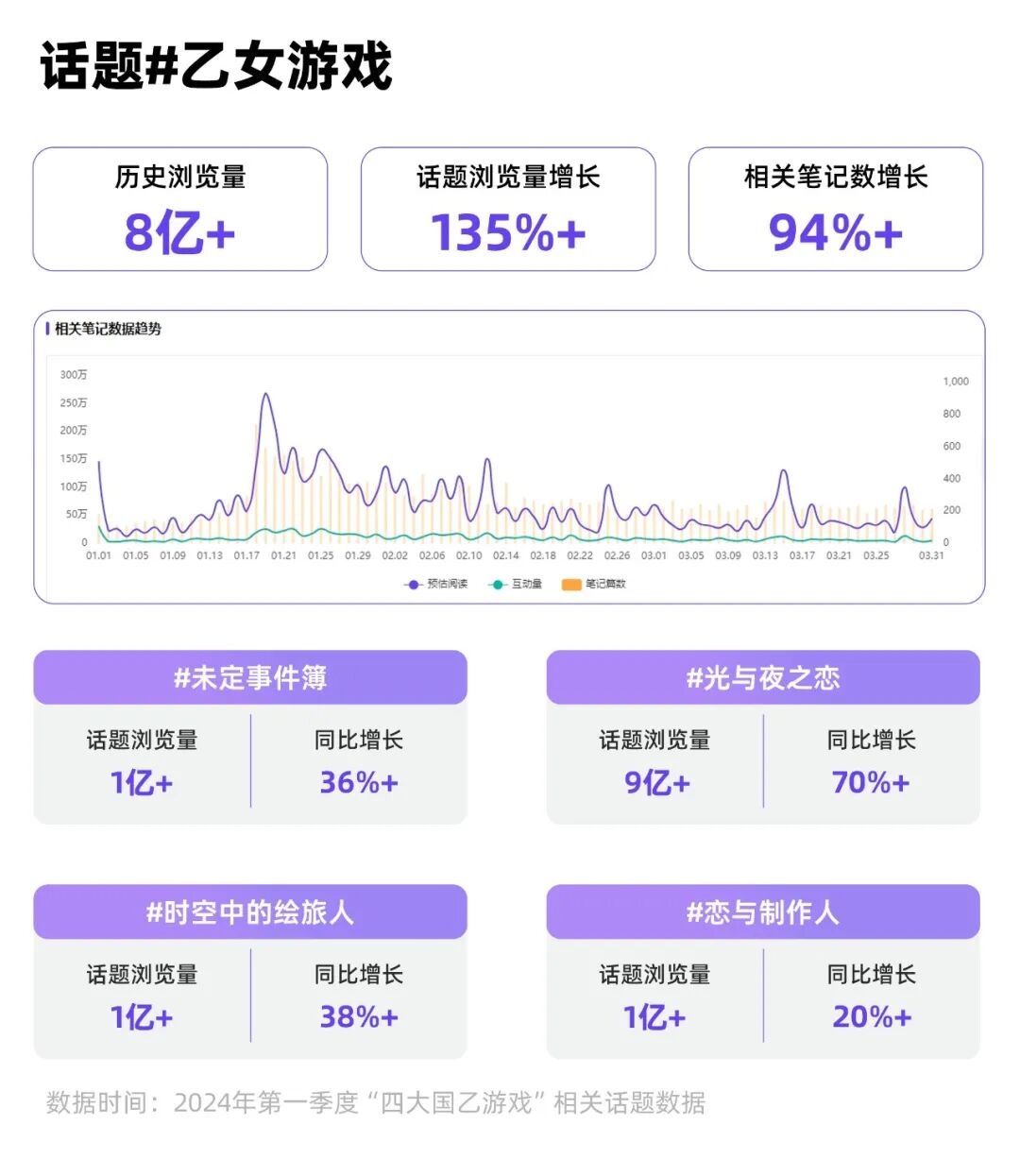 作为以女性用户为主的内容社区,小红书“乙女游戏”近来热度高涨,2024年第一季度,相关话题浏览量增长135%+,相关笔记数增长94%+, “四大国乙游戏”之一的《光与夜之恋》话题浏览量更是高达9亿+。