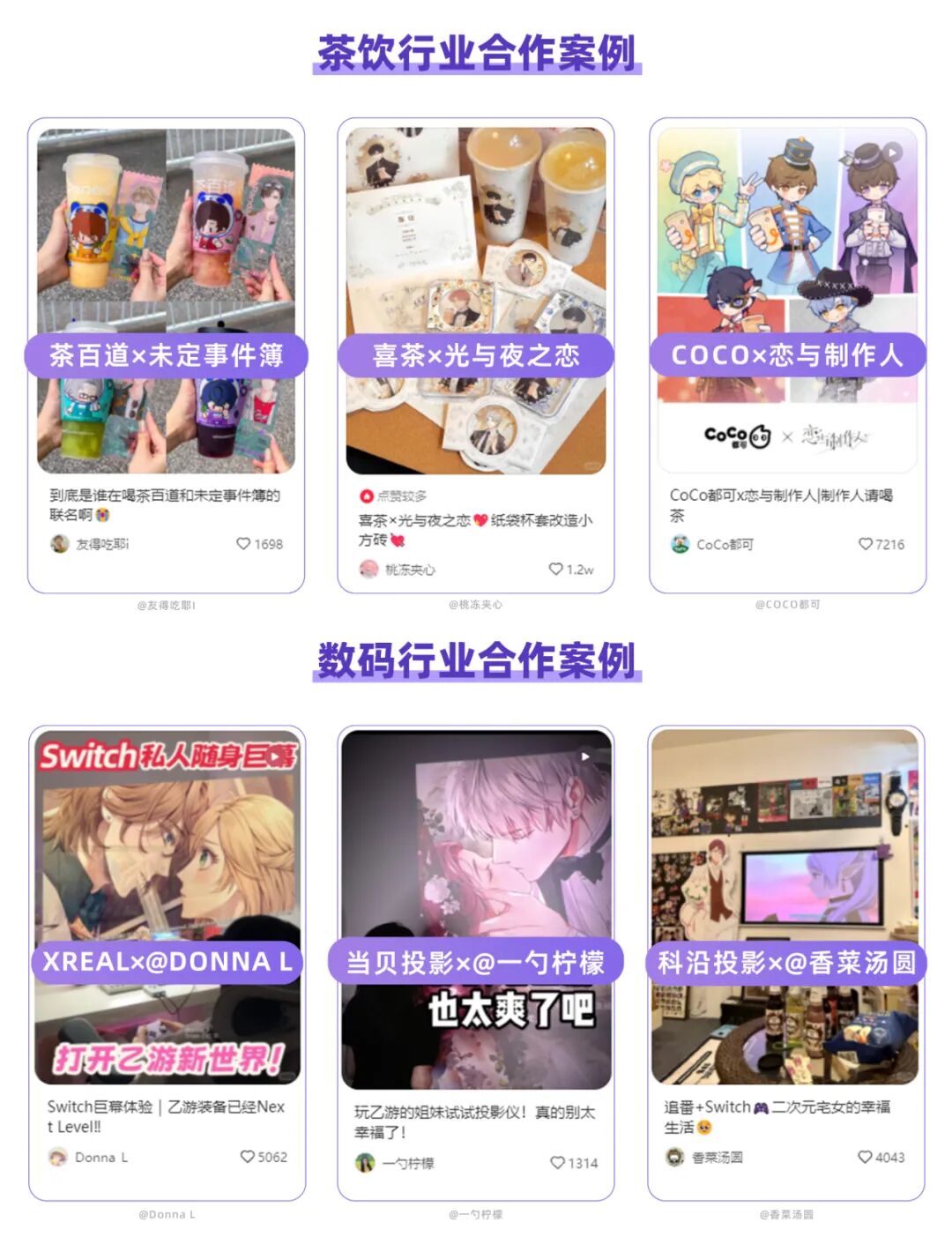 乙游市场火热之余,商业动作不断。茶饮品牌与乙游频频联名,周边卖爆售罄,喜茶与《光与夜之恋》的合作首发即爆单,联名周边商品,实现近140万元营收;联名之外,不少数码品牌如XREAL、当贝投影、科沿也瞄准乙游群体投放内容,通过“沉浸式游戏体验”种草产品。