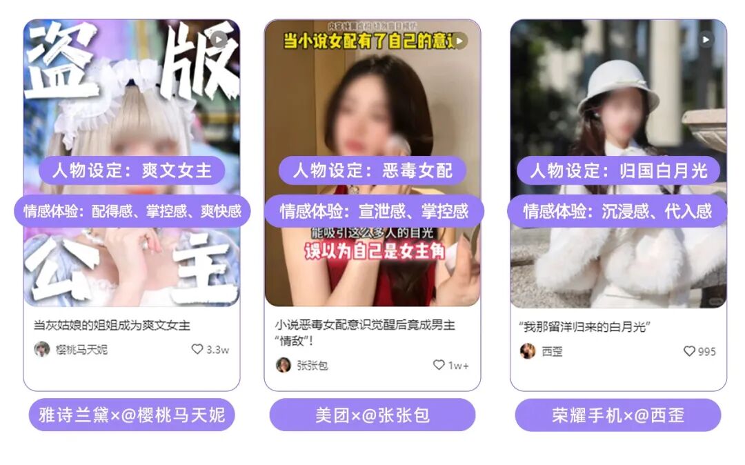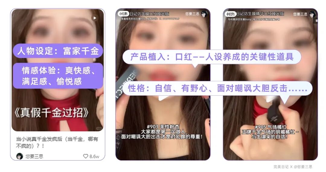 典型案例有完美日记与美妆博主@您要三思 的合作笔记《当小说真千金发疯后(当千金,哪有不疯的)?!》,互动破8万,预估点赞数高于达人日常水平824%+,视频内容中,面对假千金的嘲讽,真千金没有忍气吞声,而口红作为“人设养成”的道具之一,总能在关键时刻帮助真千金气场全开、大胆反击,实现产品的巧妙种草。