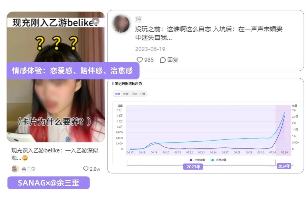 同时,内容不断强调游戏所带来的【情感体验】:游戏人物就在身边的陪伴感、沉浸式的恋爱感、给用户带来的治愈感……引发评论区强烈共鸣,该篇笔记互动量达到3W+,内容发布一年后,互动更是得到新一波的增长,长尾效应十分显著。