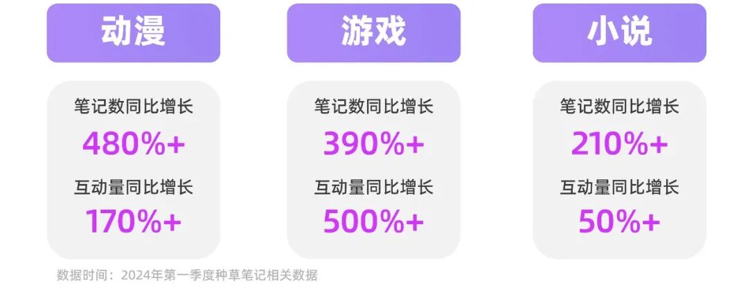 千瓜数据调研结果显示,2024年第一季度,以“动漫、游戏、小说”为代表的内容,笔记量达百万级,同比增长高达480%+,互动量达亿级,同比增长高达500%。接下来,千瓜以这三大内容载体为主线,带领品牌探索「2.5次元」种草法则。
