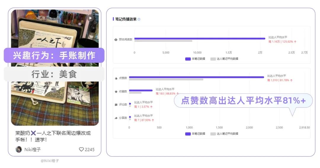 茉酸奶投放手账博主@Niki橙子,爆改国漫《一人之下》周边,剪裁包装袋,叠加手绘与个性化拼贴,制作过程兼具美学与生活意趣,贴合受众兴趣爱好的同时,又为周边提供更具创意性的使用方法,点赞数高出达人平均水平81%+。