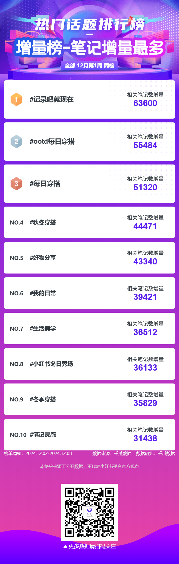 热门话题排行榜中“#记录吧就现在”排名第一,相关笔记数增量63600篇;“#ootd每日穿搭” 排名第二,相关笔记数增量55484篇;“#每日穿搭”排名第三,相关笔记数增量51320篇。