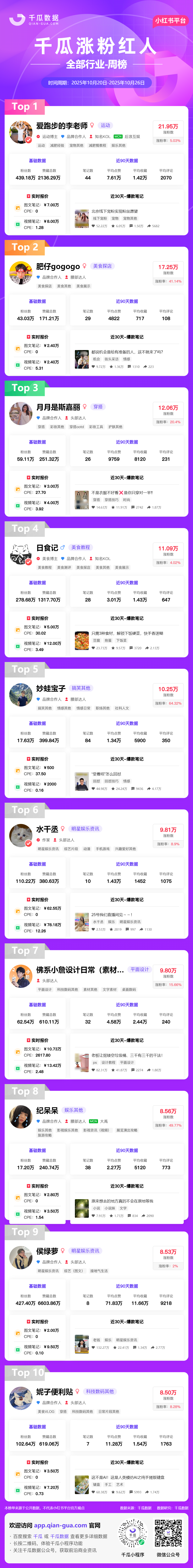 小红书涨粉红人-全部行业中“爱跑步的李老师”排名第一,涨粉数21.95万;“肥仔gogogo”排名第二,涨粉数17.25万;“月月是斯嘉丽”排名第三,涨粉数12.06万。