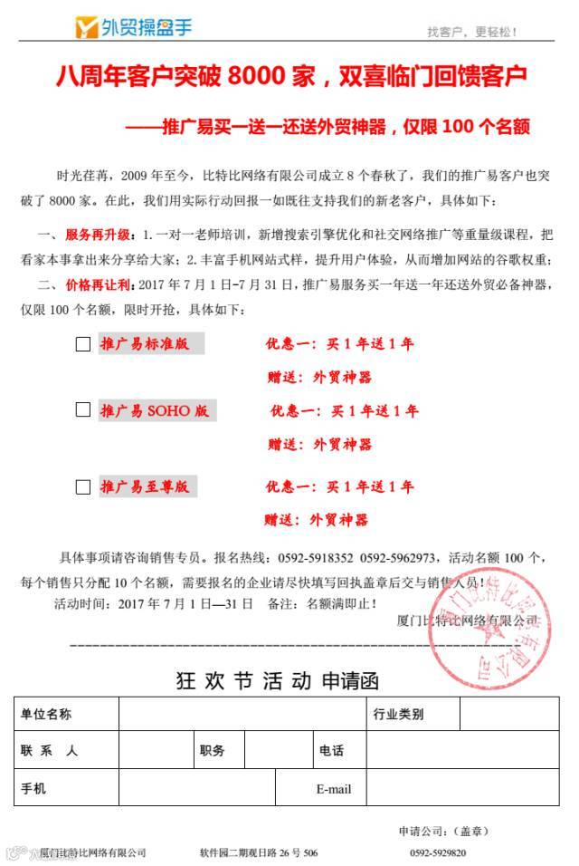 时光荏苒,2009年至今,比特比网络有限公司成立8个春秋了,我们的推广易客户也突破了8000家。在此,我们用实际行动回报一如既往支持我们的新老客户,具体如下: