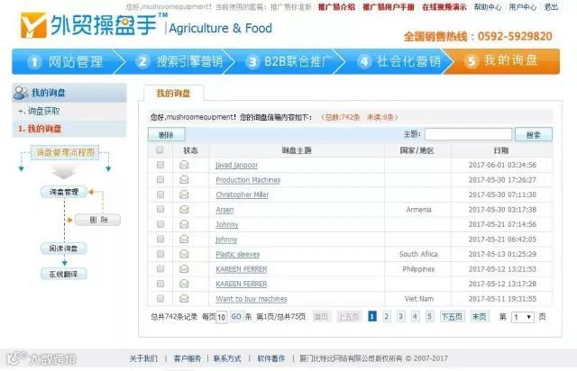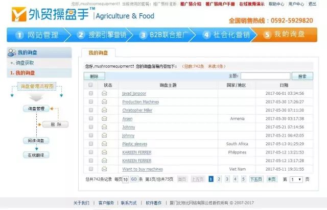 4、 询盘量742条(不含采购商直接发送到客户邮箱的询盘)