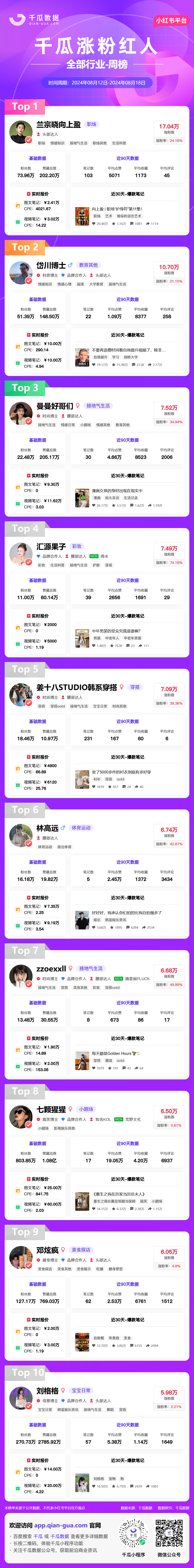 小红书涨粉红人-全部行业中“兰宗晓向上盈”排名第一,涨粉数17.04万;“岱川博士”排名第二,涨粉数10.70万;“曼曼好哥们 ”排名第三,涨粉数7.52万。