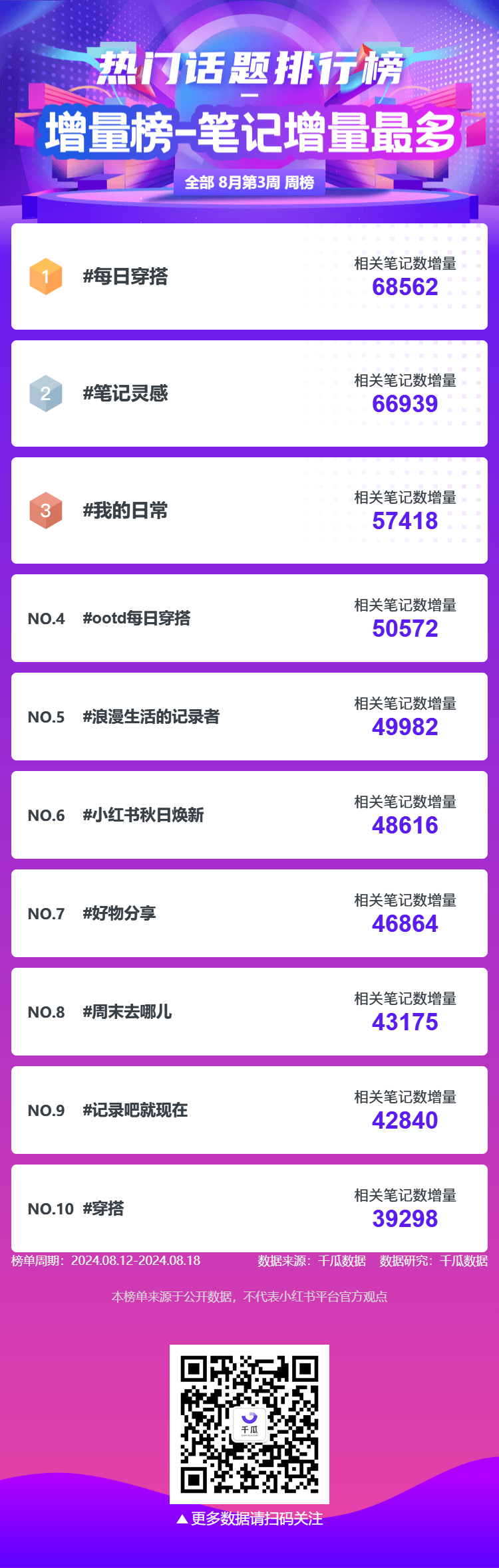 热门话题排行榜中“#每日穿搭”排名第一,相关笔记数增量68562篇;“#笔记灵感” 排名第二,相关笔记数增量66939篇;“#我的日常”排名第三,相关笔记数增量57418篇。