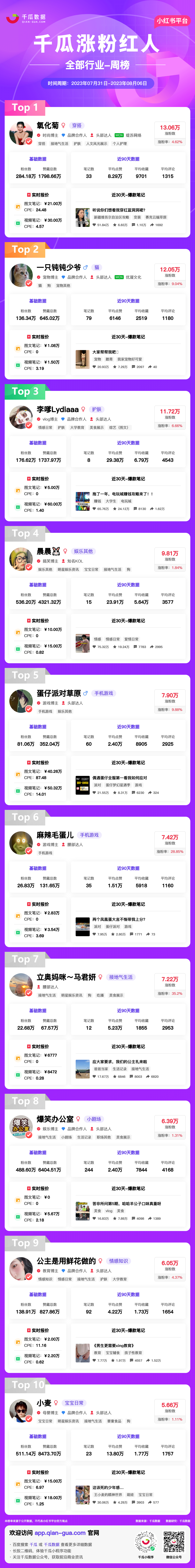 小红书涨粉红人-全部行业中“氧化菊”排名第一,涨粉数13.06万;“晨晨”排名第二,涨粉数12.05万;“李嗲Lydiaaa”排名第三,涨粉数11.72万。