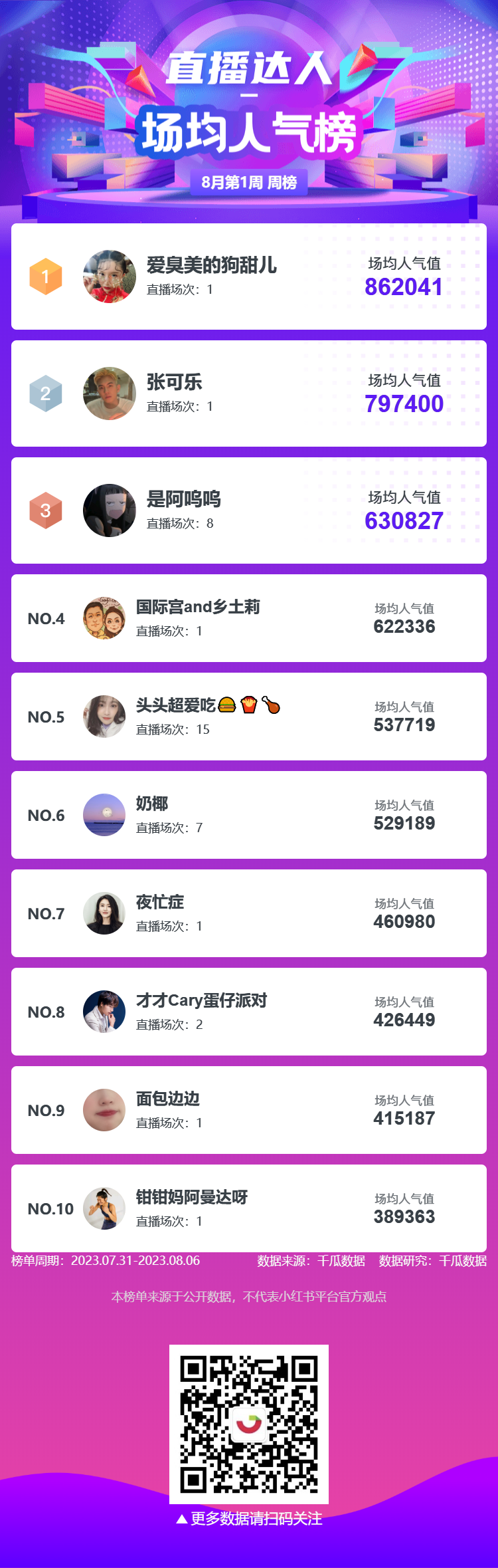 直播达人榜中“爱臭美的狗甜儿”排名第一,场均人气值862041;“张可乐”排名第二,场均人气值797400;“是阿呜呜”排名第三,场均人气值630827。