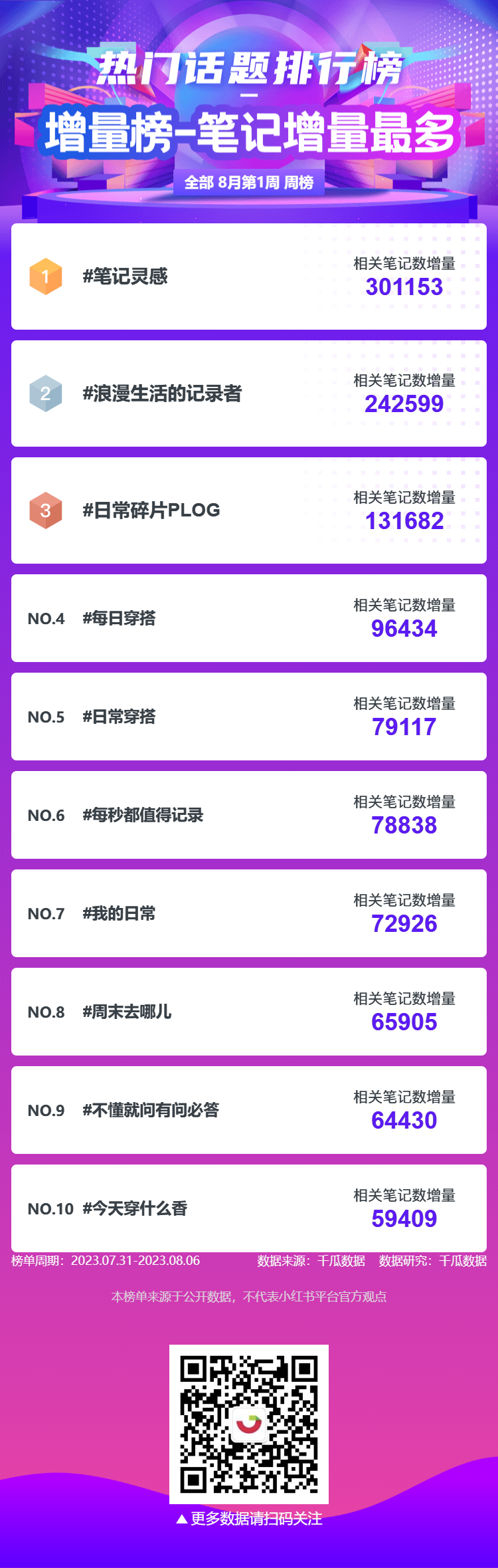热门话题排行榜中“笔记灵感”排名第一,相关笔记数增量301153;“浪漫生活的记录者” 排名第二,相关笔记数增量242599篇;“日常碎片PLOG”排名第三,相关笔记数增量131682篇。