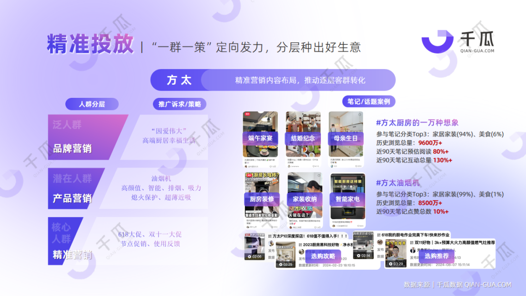 泛人群:主打“因爱伟大、高端厨居幸福生活”的品牌理念,布局“家宴、生日”等内容,话题#方太厨房的一万种想象 历史浏览量超9600万,近90天笔记预估互动量增长130%+;
