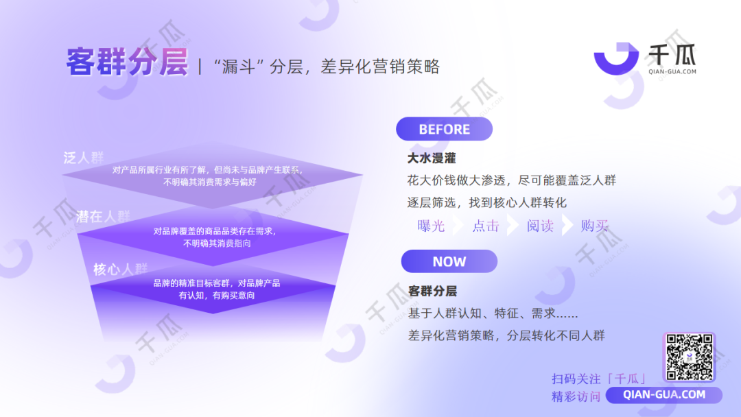 而现在,则是先进行人群分层,根据不同层次人群的认知、特征、需求、偏好等,针对性制定、执行差异化营销策略,分层转化、定向收割。